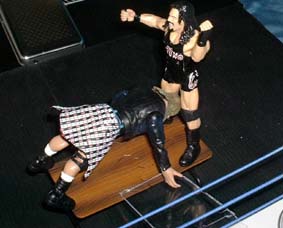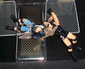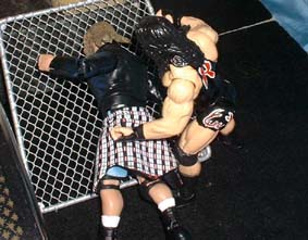 Rhyno pours on the preasure, dragging Raven up to the entrance ramp and slamming him into the steel mesh.