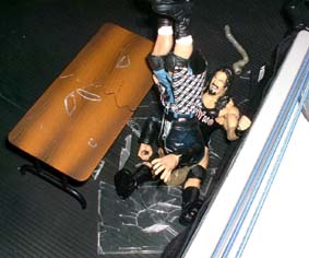 Holy Shit! He piledrives Raven though the glass, both men have got to be hurt.