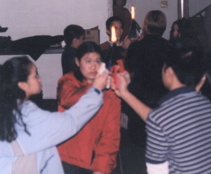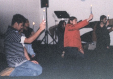 [People form a circle with their lights, making bigger flames with their lights in the middle of the circle.]