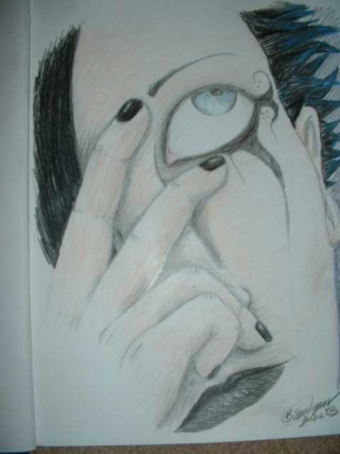 A drawing I did of a gothic guy. Surprisingly, my mom saw it and didn't freak out, she said it was good, not much else, but at least she didn't freak and try to lecture me on it... hehe. I think it turned out ok, though the flash on the camera reflected off the color and paper, as usual...