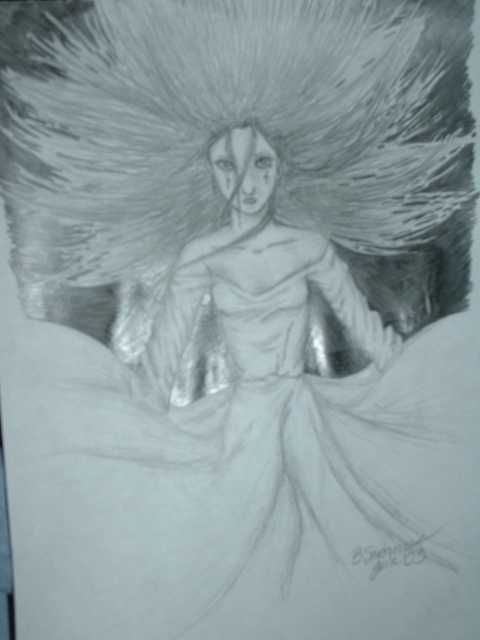 Ok, so if you can't tell, I tend to get a lot of inspirations for drawings and paintings from Terry Goodkind, author of The Sword of Truth series. This drawing is of one of the main characters, Kahlan. Once again, it is much more easily understood after you read the books... But I will attempt to explain. When Richard, the man Kahlan is in love with, is in trouble, Kahlan can bring up this extremely powerful magic. I believe it's called Con Dar, but I have to check... But, when she's in this state, she can conjure up blue lightening and make it hit anyone she feels is endangering Richard. Her physical power also increases, she will do anything to protect her love. This drawing is my interpretation of her changing to this state, though she doesn't have her angry/protective face yet, maybe I'll draw that some other time, her in action striking someone with lightening.