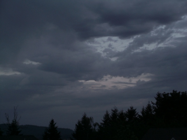 This is my favorite of all the pictures my dad took because it was starting to get dark and the clouds were just great to look at, and, as most of you should know, I love darkness, so this picture was great. Plus, no houses in the bottom area of the picture (besides the one that you can barely see), only trees and a hill/mountain off in the distance... hehe, I love this picture though.