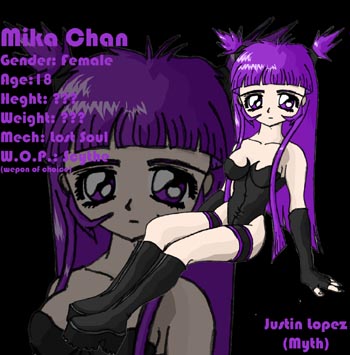 | DESCRIPTION: | this is one of the characters iv made up for my upcoming manga her name is mika, she kinda the silent and deadly type. her wepon is a giant scythe, along with two semi-autmatics, and a mini gun. her mech is named the lost soul. when she pilots her grim reaper like mech(the lost soul) she will say nothing and onley care about the death of her opponet. |