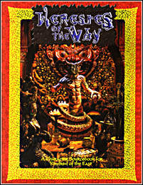Heresies of the Way is a Kindred of the East sourcebook dealing with the heretical dharmas and their motivations. In addition to offering greater information on their histories, abilities and outlooks, this sourcebook deals with a brand-new dharma: The Scorpion Eaters. Heresies of the Way also ties into Yearof the Damned by presenting five dharmas that have sacrificed much for power - and survival.