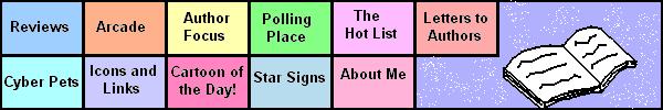 Hee hee! I am (literally) giddy with happiness! My beautiful colorful taskbar is working, my music sounds like the clearest thing in the world, and I have had over 1000 visitors since my opening in April! My Author Focus article is finally done, too. Look there to learn about Ann Rinaldi. :) Future plans: new reviews, new music. Please enjoy all the new features.*****Do you have an idea? Something I could change on my site? A new section? Maybe a good book? Then email me and you might see it happen! Start thinking! Then email me!***** -Mal