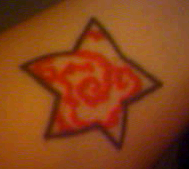 This is the tattoo I got in the back of a tattoo studio...as I said, not of the best quality. I hand-drew this star...I am not a perfect person, so I decided to have an imperfect star. Black and red, which are two of my favorite colors, were what I chose for this particular piece. The red swirls signify life, and how it's forever changing course, sometimes overlapping. This tattoo was pretty much my life, and how it's always going to be different compared to everyone else's.