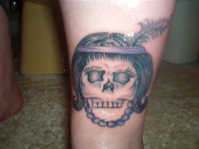 i got this tat spur-of-the-moment at the philly tattoo arts con! i met debbie lenz, a great artist from ohio, and she tattooed this little beauty on me...we call her 'irma'. once again combining my love of the macabre and flapper fashion, we created a cool smaller design. debbie is so nice...we hit it off so well! if you live in ohio you'll have to check her out...the listing for her shop is on the artist page. as well, i met many other great, extremely nice female tattooists: roxy-debbie's daughter, patty kelley of avalon tattoo in ca, and sandi calistro of chameleon 212 in colorado. all excellent artists and totally cool people!
