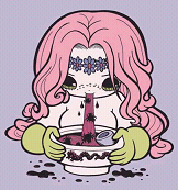 i love the cutesy-macabre style of japanese artist junko mizuno, so i had two of her pieces tattooed on my wrists! they were done by the excellent binky of body art world in point pleasant, nj. binky is an extremely cool guy, and the colors came out really bright and wonderful! they seem to be rocking some sort of a witchy theme (the one's 'cooking', and the other one's eating). i've included pictures of the original drawings so you can compare and contrast. enjoy!