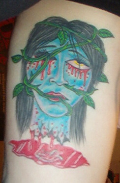 my right half-sleeve, now completed! my medusa and crying heart were done by jeff gibbs of adrenaline, my vampire woman by baba of vintage tattoo in los angeles, california (at a convention), and the rest of the half-sleeve was inked by mike schweigert of tradewinds tattoo. my medusa and siren encapsulate my fascination with greek mythology, and symbolize beauty within ugliness. my vampire girl is a revamping of a sailor jerry design, combining my love of traditional tattoos with my obsession with horror. my snake woman symbolizes my life, from my birth (when i didn't have any substance-"meat on my bones") until my death.
