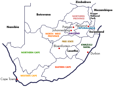 South Africa is divided into nine provinces. These provinces are Gauteng, Northern Province, Mpumalanga, North-West Province, Free State, Eastern Cape, Northern Cape, Western Cape and KwaZulu-Natal. The country has three capitals - Cape Town is the legislative capital - Pretoria, the executive capital and Bloemfontein, the judicial capital.