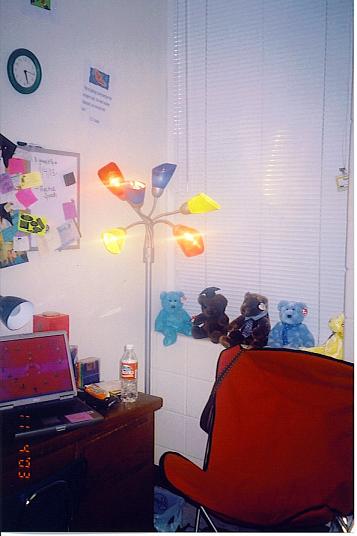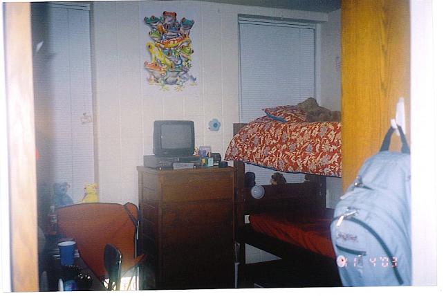My dorm room...it's hard to find a good angle, but this is probably one of the best..(ry,if you look close enuf you can probably see the bear you sent me sittin' in the window sill-behind the bed.)