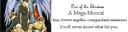 Well, well, you seemed to have arrived at the right place, my dear. This is the home of Out of the Shadows. What is this? you may ask. Well, do not fear, for I will tell you. This is a Gundam Wing fanfic which has been written as a musical- that is, there are songs inside to accentuate certain situations. Be warned that this is partially a yaoi fanfic, so if you don't like that kind of stuff, just don't read it. It's simple enough. This fic is a TWT (Timeline What Timeline) and basicly happens right in the middle of the Gundam Wing series. This fic was written by myself, Cammie, and by my sister, Piper. What I write is in black text and what Piper writes is in violet text. Alright then, enjoy, and also keep in mind that this is an ongoing fic, and will probably not be finished for quite a while. We'll try to add at least one chapter a month, but don't expect too much. Enjoy! Visit Piper's little description page here.