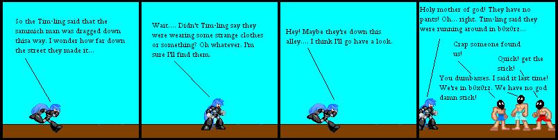 Megs's search continues, but not too far along. I still need comics for later. That is, until I get the storyline back under way. Hey! Are they who I think they are? Are those the mugg0rz in b0x0rz?