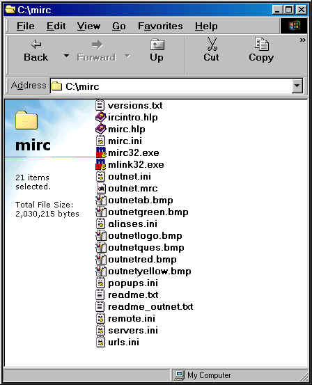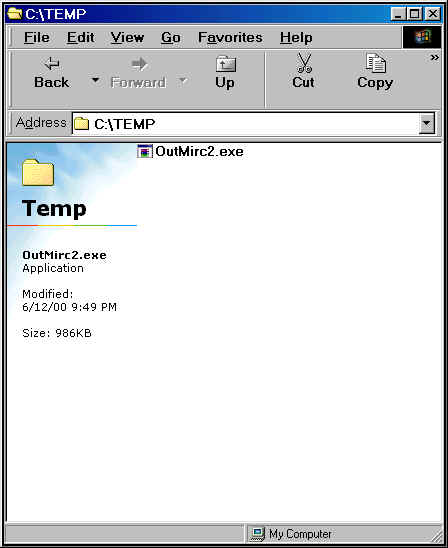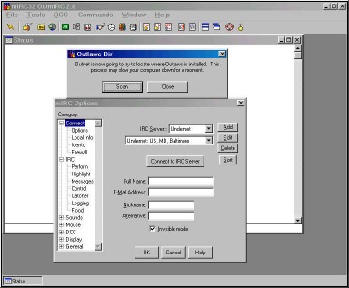 What is Outnet 2? Many people have not experienced IP games or have not played them due to the difficulty of joining a game. Well now thanks to RR_Lindow, there is a script called Outnet 2 to use with MIRC to host and join Outlaws IP games with ease. You can visit the authors pages to obtain additional information from here by using the Outnet's Home Page hyperlink. Outnet 2 is available for people that already use MIRC to chat with or play in the #Outlaws_Players channel on the Undernet. If you already have MIRC just download the script, extract it toyour MIRC directory, and load the script by typing /load -rs outnet.mrc. After it is loaded you can right click on the channel window or select Outnet from the Commands dropdown menu. Configure Outnet by selecting the Outnet Config Button and entering the directory where Outlaws is installed and the nickname you wish to use in the games. Download Outnet2 For MIRC Here ******************************************* What is OutMIRC? OutMirc was created to allow people that do not presently have mIRC chat software installed to join IRC and connect to IP games easily. OutMirc 2 is a self executable zip file that has mIRC and Outnet included in it. I have ran it through a couple of virus scanners for your protection so you don't have to worry. OutMirc is designed to where once it is installed and setup, it will take you directly to the #Outlaws Players Channel on the Undernet where you will find some of the friendliest Outlaws around and many fine shooters to test your skills. This software will allow Outlaws players to join the IRC channel automatically, launch and join games as easy as the Zone. Installing OutMIRC The following will assist you in installing the software and I have included some screenshots to give you some visual help if you need it. Download the file by hitting the red icon above. Once you have the file downloaded in a temp directory, just double click on the file called OutMirc2.exe (screenshot) and install it in a directory of your choice. It will then bring up a box where it will ask you what directory you would like to place the mIRC software files into, for this example I will use c:\mirc. (screenshot). To start MIRC, just double click on the mirc32.exe file which you have installed in the C:\mirc directory (screenshot) and it will open the mIRC software. To make it easier to access the startup of mIRC just drag the mirc32.exe file onto your desktop to create a shortcut. When you have double clicked on the mirc32.exe or the shortcut a box will popup stating "Outmirc is now going to try to locate the directory the Outlaws is installed in. (screenshot) Just press the scan button and it will find the Outlaws directory automatically for you. Then hit the button Use This Dir or enter the Outlaws directory manually.