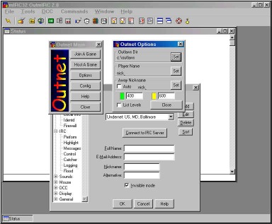 Now its time for the mIRC setup. Enter whatever name you wish in the top box, email address and the nickname you would like to use in mIRC and a alternate nick. You can enter a maximum of 9 characters on your nick name. Then hit the OK button. (screenshot) If someone else in on MIRC with the same nickname you will need to change yours to something else or MIRC will not let you connect to the server. If this happens just type /nick newnick (your new nickname) in the bottom of the status window when attempting to connect to the server. |