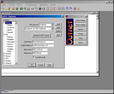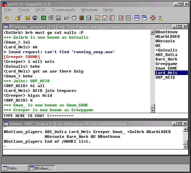 Connecting To connect to the IRC server, at the top of mIRC you will see a tool bar with a broken lightning bolt icon on the far left side. Click on that and you will then connect to the server and join the #Outlaws_Players channel where we chat and play the Outlaws game. Walla! You now have joined the channel where we play. (screenshot) The people that have the @ sign in front of their nicknames are the channel operators which uphold the law in the channel. The Outlaws_Players channel is a family oriented chat room for all ages to enjoy. We do not allow cussing, extreme rudeness, discussion of drug related topics, racial or sexual harassment in the channel. Now you have MIRC up and running and have joined us in the channel please feel free to join in the chat, ask questions, play outlaws, join the ladder and play in the tournament. If you need assistance in running Outnet you can look at the help area in Outnet or ask anyone in the channel. mIRC help can be found in the program under the help menu. Good luck! |