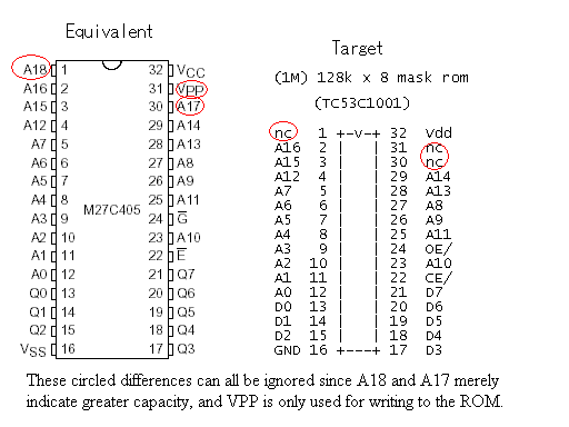 C roms - Check and see if your reader will take an MX23C6410. If it will, then read the C roms in as that since that is an 8mb equivalent. BUt if not, then use the ST M27C322. C roms are really 8mb, but unforunately, my rom reader doesn't have support for anything like that. So what I do is read it with this 4mb ST rom and manually bank the addressing to switch between the 1st half of the data and the 2nd half of the data. To manually bank, carefully bend up leg 11 (Address line 21) so that that one leg is in the air. Use some kynar wire and a wire wrapping tool to make a connection between leg 11 and and leg 12 (GND). Place it into the reader and make sure that leg 11 is NOT inside the reader socket. Save the file as cx_a.rom. Repeat this process except this time, move the wire so that leg 11 is now tied with leg 22 (VCC) instead. Save the file as cx_b.rom. Now go to your command prompt and type the following: copy /b cx_a.rom + cx_b.rom cx.rom This will copy the two halves together and you're done.
