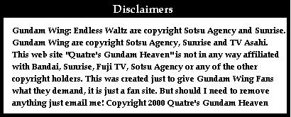Hey everyone I'm the webmaster here at Quatre's Gundam Heaven/3000. I'm sad to say that I've decided this site is not really going anywhere, so im not going to update anymore, but not to fear I have learned how to make really good anime music videos.
