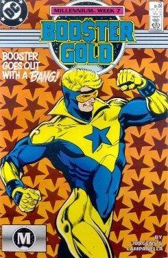 Michael Jon Carter is from the 25th century, where Michael was a brilliant quarterback with great promise as a professional player. This potential was lost, when Carter was caught betting on games in which he played. "Booster" Carter, a nickname he received for his tremendous skills, had started gambling in order to pay for his mother's delicate operation. Realizing he could make enormous amounts of money, he continued to bet even after her recovery and was soon caught. Banished from the college athletics and shunned by the pros, Carter drifted throughout the eastern seaboard until he found employment as a janitor at the Space Museum. Once there, he realized that he had no future in that era, due to his past crimes. But while in college Carter became interested in studying the great heroes of the ages. When he came across Rip Hunter's Time Machine, he knew his future was in Earth's past. So he stole various pieces of advanced equipment, a security robot, and the Time Machine itself and journeyed back to the 20th century. Soon after his arrival, Carter interfered in an assassination plot against the President and Vice-President of the Neo-United States. Using the publicity that followed, he took the name Booster Gold and became the world's first super-hero dedicated to commercial pursuits rather than noble causes. Despite this, grateful for saving his life, the President forced the Justice League to make him the sixth recruit. In the League, he met his best friend and usual “business partner” in his harebrained get-rich-quick schemes, the Blue Beetle. Personality wise, he is somewhat like Wally West and is always trying to get money from Andrew Kelly for crazy ideas including one for a kiddy TV show call Mighty Morphin Power Rangers. Andrew rejected it as stupid.