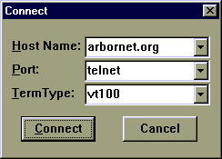 Now a Connection box will pop up. Type arbornet.org into the Host Name box. This is he name of the computer you will connect to. Verify that Port is set to either Telnet or 21. Now click Connect. After 1-10 seconds you will see the login screen, depending on your connection and arbornet.org's current traffic.