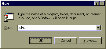Telnet is automatically installed on a Windows computer. Click the Start button, then click Run. Now type telnet into the box and click OK.