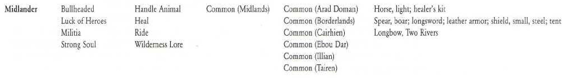 Los Midlanders son personas procedentes de los pocos centralizados Reinos de la Meseta y las tierras centrales del continente, como Andor, Murandy, Far Madding, Ghealdan, o los villorrios dispersos por el Campo de Caralain y en torno al curso del río Manetherendrelle como la Región de Dos Ríos, el Campo de Emond y Baerlon. PERSONALIDAD: Tienden a ser personas de carácter sólido, dependientes unos de otros, adaptables, y duros trabajadores. Incluso en aquellos lugares donde rara vez ven a extranjeros son abiertos y amigables, siempre dispuestos a echar una mano a un Extranjero si se encuentra en un apuro. No obstante, no tendrán compasión de aquellos que traicionen su confianza, les opriman o abusen de ellos. Aunque lentos para la ira, pues son de carácter un tanto pacífico, un Midlander, una vez que se enzarza en un combate lo llevará hasta sus últimas consecuencias, siempre buscando la Victoria. En todos los Midlanders hay una cierta Nobleza interior que se trasluce en lo que hacen y en su modo de comportarse: Suelen ser virtuosos e infatigables seguidores de la Senda de la Luz, y muchos reputados Héroes de las Leyendas procedían de esta zona del mundo. Existe la creencia generalizada entre los Historiadores y Geógrafos que es fruto de la Antigua Sangre, que bulle aún con fuerza por sus venas. PERSONAJES MIDLANDERS: Revisa el siguiente Portfolio y elige: 1) Una Dote de Trasfondo (Background Feat), entre Terco (BullHeaded), Suerte de los Héroes (Luck Of Heroes), Miliciano (Militia), y Espíritu Fuerte (Strong Soul). 2) Una Habilidad de Trasfondo (Background Skill) Se te regalan CUATRO RANGOS por la cara que no cuentan como Rangos de Profesión, y se te convierte en Habilidad de Clase para ti para que le añadas los Rangos que quieras durante la Creación de Personaje o cuando subas de nivel) 3) Un número de Dialectos (Bonus Languages) igual a tu Modificador de Inteligencia. 4) Un Kit de Equipo. |