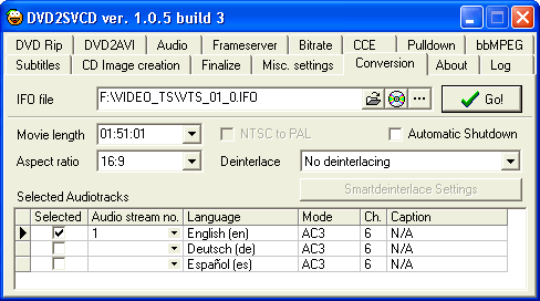 If you have an NTSC disc and would like to convert it to PAL check that button. Keep in mind that this feature is in beta state. If you have a PAL disc and after converting it's interlaced you have to do it again and this time check PAL Telecined (interlaced). If you want your PC to be shut down after the conversion is finished check the Automatic Shutdown checkbox.