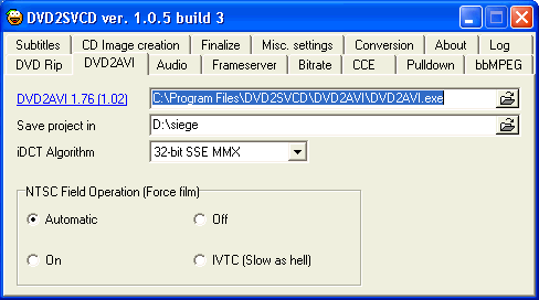 Here you can select if Force Film should always be on (that was the default in earlier versions) or if you select Automatic DVD2SVCD will analyze the DVD2AVI project to determine whether to use Force Film or not.