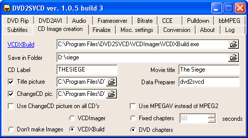 DVD2SVCD combines many programs together: vStrip to rip the DVD (best ripper around), DVD2AVI to create a DVD2AVI project, Mpeg2dec and Avisynth for the fastest frameserving from DVD2AVI to CCE including bicubic resizing, azid with auto restart to make an optimal AC3 -> WAV conversion, SSRC to downsample the audio files, then toolame for the best WAV -> MP2 compression there is, video encoding in CCE, then applying pulldown flag in case of an NTSC video, multiplexing video and audio using bbMPEG and finally creating SVCD images for burning using VCDImager. Furthermore DVD2SVCD supports multiple audio streams and selectable subtitles (the latter only works on standalone players). The program comes as a complete package that contains all the free softwares requires. You only have to add CCE SP 2.50 (and no other version).