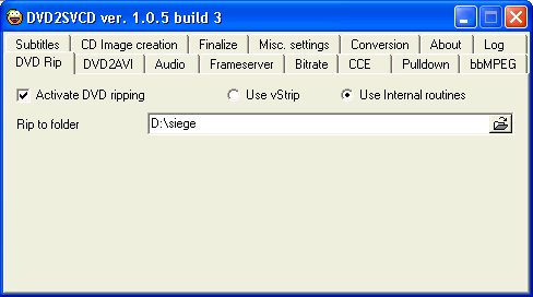 It would be possible to use DVD2SVCD from an already ripped disc but I strongly suggest you let DVD2SVCD do this as well as it uses the best program on the market but spares you to learn the complicated commandlines required for it. So check Activate DVD ripping. If once you're starting the whole process ripping should not start come back here and select Use vStrip instead.