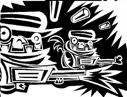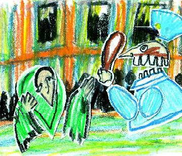 A mad policeman abuses his powers by beating a poor woman to death. (Cut-out animation)