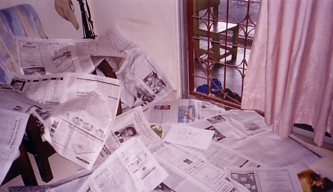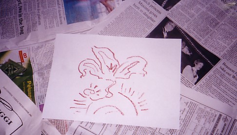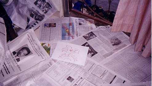 Experimental photos of the flower drawn in plain paper among scattered newspaper.