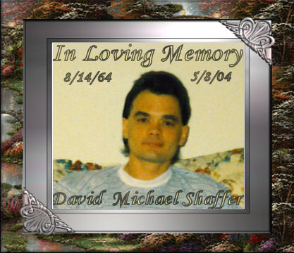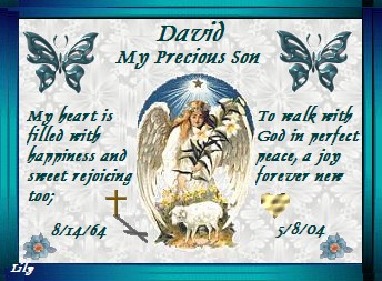 ![]() David Micheal Shaffer August 14, 1964 - May 8, 2004 ![]() ![]() ![]() He's gone too soon, forever gone forever is such a long time we don't know when it ends, or if it does, or if it matters. The end for us will be a new beginning in God's world. We'll be reunited forever, and forever is such a long time. Two thoughts on forever One makes us sad and we want it to end. The other, yet to begin, will never end Forever is such a long time. We didn't know when they left that forever could be a day, One that never ends. Time has somehow passed, the pain is still so strong, and will last until we say "enough", Forever is too, too, long, Our memories last forever maybe forever is not so long He's our child, our man-child He's gone, but our memories last forever. Sweet memories of him as a baby Gangly legs, handsome, a funny kid A teen, with long hair, unsure of himself, Then a man, our man-child became a dad. We won't see him until forever ends; And forever is such a long time. A part of us is missing, forever lost We've lost our son. It's the same thing. A piece of us is gone, and cannot be replaced. Time eventually heals and leaves a scar That lasts forever, and forever is a long time. ~ Author Unknown ![]() ![]() ![]() ![]() ![]() ![]() ![]() ![]() but that was nothing new. We thought about you yesterday, And days before that too. We think of you in silence, We often speak your name. Now all we have are memories, And a picture in a frame. Your memory is our keepsake, With which we will never part. God has you in His keeping, We have you in our hearts ~ Author unknown ![]() ![]() ![]() ![]() ![]() ![]() ![]() ![]() ![]() ![]() ![]() If I should ever leave you whom I love To go along the Silent Way, grieve not, Nor speak of me with tears, but laugh and talk Of me as if I were beside you there. (I'd come - I'd come, could I but find a way! But would not tears and grief be barriers?) And when you hear a song or see a bird I loved, please do not let the thought of me Be sad . . . For I am loving you just as I always have . . . You were so good to me! There are so many things I wanted still To do - so many things to say to you . . Remember that I did not fear . . It was Just leaving you that was so hard to face . . . We cannot see Beyond . . . But this I know: I loved you so - 'twas heaven here with you! by Isla Paschal Richardson ![]() ![]() ![]() We did not know that morning that God was going to call your name. In life we loved you dearly, in death the same. It broke our hearts to lose you, you did not go alone, for part of us went with you the day God called you home You left us peaceful memories, your love is still our guide, and though we cannot see you, you are always by our side. Our family chain is broken, and nothing seems the same, but as GOD calls us one by one, the CHAIN will link again. ~ Author unknown ![]() May the Lord give your heart a very special peace for you to endure the loss of your son and a heartache that never can end He will wipe away every tear and there will be no more sorrow or pain Love and Blessings Ann, Laurasmom ![]() ![]() ![]() ![]() ![]() ![]() ![]() ![]() ![]() ![]() ![]() ![]() ![]() ![]() A friend can hear a tear drop. ![]() This webpage is created ![]() ![]() ![]() ![]() Maria's Tribute to Christopher ![]() ![]() Your ANGEL is now safe in HEAVEN with our LORD MAY HE FOREVER REST IN PEACE GOD BLESS Sue-Anne/LEE ![]() ![]() ![]() ![]() ![]() ![]() ![]() Sign My Guestbook ![]() ![]() ![]() ![]() ![]() |