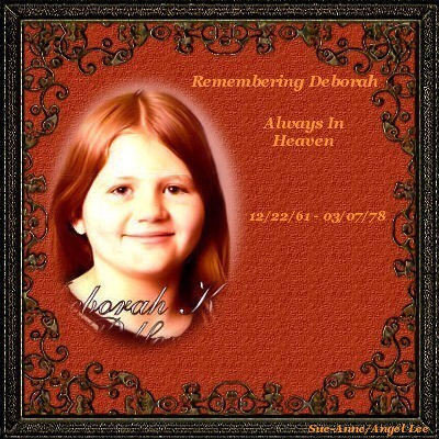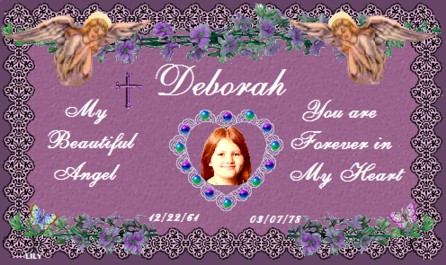 ![]() Deborah Kay Pelfery December 22, 1961 - March 7, 1978 ![]() ![]() ![]() Performed by Barbara Mandrell Faded photographs, The feelin's all come back Even now sometimes you're feelin' so near And I still see your face Like it was yesterday Strange how the days turned into years Years of hanging on To dreams already gone Years of wishing you were here After all this time You'd think I wouldn't cry Its just that I still love you After all these years Night time gently falls Another day is gone I turn around to find you're still not here I leave the hall light on In case you come back home Funny, I can say that for years Years of hanging on To dreams already gone Years of wishing you were here After all this time You'd think I wouldn't cry Its just that I still love you After all these years After all these years ![]() ![]() ![]() ![]() ![]() ![]() ![]() ![]() ![]() Sometimes while looking through the closet, I catch myself; Smelling your clothes, just to catch a scent of you. Sometimes while surfing the radio channels, I catch myself; Listening to a song you once listened to. Sometimes when I'm lonely and need to call someone, I catch myself; Calling a person who was a friend to you. Sometimes when looking through the photo album, I catch myself; Looking at pictures of only you. Sometimes at night when I can't sleep, I catch myself; Crying over memories I have of you Sometimes at night when I pray, I catch myself; Thanking God for blessing us with you. Written By: Doyle Alldrege In Memory of His Son Yancy Doyle Alldrege ![]() ![]() ![]() ![]() and Michele my youngest daughter that I lost when she was 18. ![]() My Mom is a survivor, or so I've heard it said. But I hear her crying at night when all others are in bed. I watch her lay awake at night and go to hold her hand. She doesn't know I'm with her to help her understand. But like the sands on the beach that never wash away... I watch over my surviving mom, who thinks of me each day. She wears a smile for others...a smile of disguise. But through Heaven's door I see tears flowing from her eyes. My mom tries to cope with death to keep my memory alive. But anyone who knows her knows it is her way to survive. As I watch over my surviving mom...through Heaven's open door. I try to tell her that angels protect me forever more. But I know that doesn't help her or ease the burden she bears. So if you get a chance, go visit her...And show her that you care. For no matter what she says...no matter what she feels. My surviving mom has a broken heart that time won't ever heal! ~ This poem was written by Kaye Des'Ormeaux and dedicated to Clarissa ![]() ![]() ![]() ![]() ![]() The mention of my child's name may bring tears to my eyes, But it never fails to bring music to my ears. If you are really my friend, let me hear the music of her name! It soothes my broken heart and sings to my soul! ~Author Unknown ~ ![]() ![]() ![]() I am so very sorry for what you went through sweet girl. Friends who were not really your friends. And being in a place at the wrong time. But now you are safe in GODS ARMS. REST IN EVERLASTING PEACE DEBORAH Sue-Anne~~~Lee'sMom ![]() I would like to share a poem that my ANGEL Lee wrote. ![]() Looking out a different window With a different point of view Trying to get my feet wet In places that are new Time is moving me on Placing me in doubt Trying to move this big wall Trying to find a way out Left in a strange place With nothing but the clothes I wear Nothing to give Nothing to share When I get my head straight In this place I now call home I'll tell you of my trek In this room I now roam Written By Lee Henry Aguilera 10-17-74~09-14-2000 Sue-Anne~~~Lee'sMom ![]() ![]() ![]() ![]() With Love Ann, Laurasmom ![]() An angel that left too soon but will be forever remembered and loved Ann, Laurasmom ![]() ![]() ![]() Karen Lyn Jenkins, Mother of An Angel with Pink Wings Geoffrey P. Edwards ![]() ![]() ![]() ![]() ![]() ![]() ![]() ![]() ![]() ![]() ![]() ![]() A friend can hear a tear drop. ![]() This webpage is created ![]() ![]() ![]() ![]() ![]() Maria's Tribute to Christopher ![]() ![]() ![]() ![]() ![]() ![]() ![]() ![]() Sign My Guestbook ![]() ![]() ![]() ![]() |