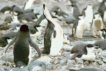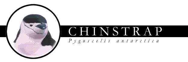 Penguins live in groups that are called rookeries. Chinstraps are probably be the most numerous penguins with a population estimated at 12 to 13 million. Imagine looking for your parents among millions of others! In the Penguin world, chicks and parents recognize each other's calls and always find one another. Even while the chick is coming out of it's egg, it is calling so it's parent will get to know its voice. Food for the chicks comes straight from a parent's mouth! The adults return with undigested food stored in their crop (A special pouch in the parent's mouth). A chick fits it's bill inside the adult's mouth to receive the food. The Chinstrap Penguins appetite consists on Fish, Squid, Krill and a shrimp-like crustacean that is a key species in the Antarctic ecosystem. | |||