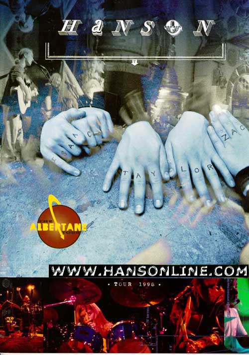 After seeing Mackie 3 times, and Jessie and Avie once we all went up and Lynn got something to drink and we all found a not-nearly-as-crowed-as-the-rest suvioner booth and bought a lot of stuff. JJ got the brown Hanson tee shirt w/ the huge picture on the back, and a tour program, Carly got a concert Hanson tee shirt that said every place the Albertane tour would be stoping at on the back of it, a tour program, and a suvioner pass. Lynn got a 4 sticker set, Andrea got a HUGE AND I MEAN HUGE wall size poster of Hanson from the "Weird" video, a tour program and a Hanson hat, and I got a sticker set and a tour program. After we all bought our stuff all 5 of us went to the bathroom so Carly, and JJ could put their new tee shirts on and so Andrea could fix her hair to put her new hat on.