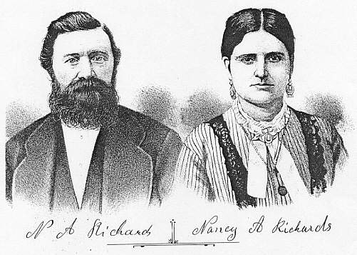By that union [Abraham and Grace] there were ten children, six sons and four daughters, five of whom have survived the parents and living. Keen W. Fields, one of the surviving sons is a substantial farmer and resident of Shelby County, Ill. Cynthia is the wife of L. H. Turner and is also a resident of the above named county. Benjamin R., is a resident of this County, Steven L., of Toledo, Cumberland County, Ill., and Mrs. Nancy A. Richards, the subject of this sketch, are the names of the survivors of the family of Abraham Fields. Mrs. Nancy A. Richards was born on the old homestead in White River Township, Gibson County, Ind., Jan. 12, 1823. She remained at home until her marriage to William Martin, which happy event occurred Aug. 5, 1840. Mr. Martin was a native of Kentucky. He died Feb. 14, 1852 leaving his widow and three children. One only yet survives, whose name is Jane. She is the wife of James L. Erwin. They have four children, whose names are Nannie A., Anna Maud, Nick A. R., and Edna Florence Erwin. On the 4th of May, 1854, Mrs. Martin nee Fields, married Mr. Nicks A. Richards. He was a native of Tennessee, born near the city of Nashville March 16, 1829. The family immigrated soon after his birth to Richland County, Ill., where Mr. Richards was reared. He came to Gibson County in 1852, where he remained until his death, which sad event occurred July 13, 1874. This union was productive of great happiness as Mr. Richards was a kind, indulgent husband, possessing an affectionate nature and domestic habits. He was strong believer in the religious tenets of the Baptist Church, although not a member of that religious organization. He died universally regretted.