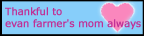 | THIS IS TO, OF COURSE, EVAN FARMER'S MOM. I WISHED MORE PEOPLE WOULD THANK HER BECAUSE SHE IS A HEROINE. SHE HELPED EVAN THROUGH THE HARD TIMES AND ENCOURAGED HIM. I STRONGELY BELIEVE HIS MOTHER IS THE MOST IMPORTANT WOMAN IN HIS LIFE. WHEN EVAN WAS VERY VERY DEPRESSED SHE GAVE HIM INSPIRATIONAL QUOTES AND TOLD HIM TO PUT THEM ON HIS BEDPOST TO REMIND HIM HE WAS GOING TO BE OKAY. SHE DID THAT FOR ABOUT A YEAR. THAT REALLY HELPED EVAN AND STOPPED HIS DEPRESSION. SHE'S ALSO A VERY STRONG WOMAN. SHE WAS DIAGNOSED WITH BREAST CANCER BUT SURVIVED WHEN SHE HAD SURGERY. I AM SO GLAD SHE IS DOING FINE NOW. SHE ALSO HELPS THE KOMEN FOUNDATION BY VOLUNTEERING AND SHE IS THE TREASURER OF IT. EVAN'S MOTHER, I HOPE YOU READ THIS BECAUSE OF YOU, EVAN BECAME THIS SUCCESSFUL ACTOR AND YOU ARE THE ONE THAT MADE HIM REALLY HAPPY. YOU ARE HIS #1 FAN. I WISH I KNEW YOU BECAUSE YOU ARE SUCH A GREAT PERSON AND I KNOW EVAN WAS MOSTLY INFLUENCED BY YOU. EVAN'S FANS (LIKE ME)WILL BE THANKFUL ALWAYS. WITH LOVE, NAOSONIC |