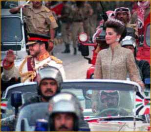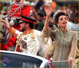 Queen Rania waves to the crowds as she and King Abdullah process through the streets of Amman