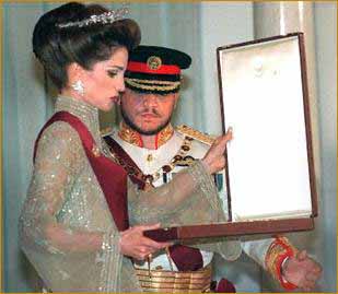 King Abdullah presents Queen Rania with Jordan's highest decoration.