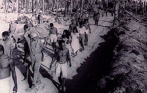 Lantir, an alap, or landowner, on Kwajalein, Carlson, and Carlos islands, and six other Marshallese elders shared their stories of the war years with Kwajalein community at the Religious Education Building last week. Phillip and Alter Langrine served as translators for the group. The event was sponsored by the Marshallese Cultural Society. Dr. Eric Lindborg, President, and Cris Lindborg, Director of Exhibits at the Marshallese Cultural Center, organized the unique program. More than 50 people filled the room to hear the tales. Pictures from Operation Flintlock, the invasions of Kwajalein, Roi, and Namur Islands, lined the back wall. Long-time resident Pat Cataldo gave an overview of the Japanese era in the Marshall Islands, 1914-1944. At the front of the room, however, sat living history - a panel of seven Marshallese who lived through the war years on different islands and under different circumstances. Lantir, for example, left her bunker to find war dead strewn along the beach. She sat and drank from a canteen she took from a dead soldier. Shortly afterward, American soldiers approached her, rifles pointed at the ready. Frightened, she couldn't speak Marshallese or English. Instead, her words came out in Kosraean. Fortunately, American soldiers took her to a field station, where she was given food and water. Nearty Korok, an alap of Erro, in the mid-atoll corridor, survived in a bunker on Kwajalein during the bombardment. Having come to the island in September 1943 for medical treatment, the then 11-year-old girl lived with siblings. One sister's husband worked on Kwajalein for the Japanese. Then bombs began to fall. |