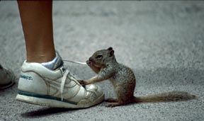 When the squirrel realized its ranting and raving were having absolutely no affect on the big hawk, and that it couldn't jump high enough to shout eyeball to eyeball with the hawk, the squirrel made a direct attack on the hawk's feet!