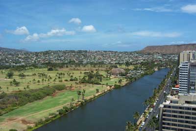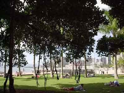 World Famous Waikiki Beach as seen through the branches of a banyan tree.