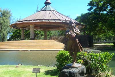 A hula girl statue in front of the Kapiolani Park Bandstand