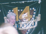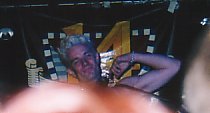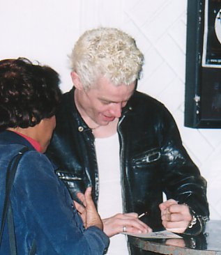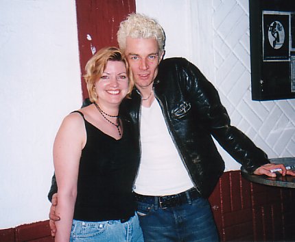 I was so nervous when it was my turn to go up and meet James. I started shaking a little bit and I was a little numb. The adrenaline was really flowing. What was I going to say?? He said hi to me, and I said hi back. I thanked him for coming out and doing this for the fans. My voice was shaking, and I know he could tell I was nervous. He leaned toward me and whispered, "You know what? I still get nervous every time I play." I had heard him say this before in interviews, but I thought it was an incredibly sweet gesture for him to try to make me feel more at ease. He took the picture I had brought for him to sign and said, "What's your name?" I said, "Tanya with an 'a'" (the standard response). He paused a little bit after he wrote the "T" and I spelled the rest of it out for him. The pen he was writing with started to run out of ink when he got to his name and he shook it up and down to get it working again ("Come on, don't run out!") I took the time he was signing to stupidly say, "I'm a really big fan of your work." He thanked me and handed the picture back and I said, "Can I take a picture with you?" He smiled, almost like he was surprised I asked him, and said, "Sure." He put his arm around me, and I put my arm around his waist and Cass took the picture (yay Cass!). After the picture, I gave him a little squeeze (without even thinking) and he squeezed me back. I turned to him and thanked him repeatedly. He smiled and again looked a little surprised. Sigh! Then I had another great moment when Cass went to have him sign the "James Marsters" 2002 calendar I made for her for Christmas. He thought it was really cool and she pointed me out to him (I was standing nearby) and he made eye contact with me and gave me a nod, or some sign of approval. Wow! That was really cool too :)