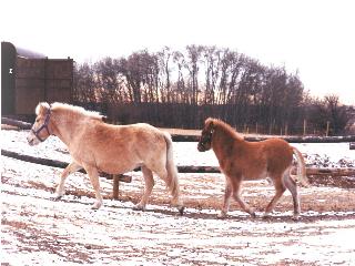 When we first got Steina (August 98), she was a very shy timid horse that ran away as soon as she saw someone entering the fence of her pasture. She was extremely head shy. She never kicked (thank God) and once caught acted very mannerly, but she didn't trust us enough for some activities. Now close to being a year later, Steina trusts her main care-givers (there's about 4 or 5 of us). Well now it's going to sound like I'm describing a different horse, because I guess I am. Now instead of running away at the sight of people, she comes as quick as she can. She picks up her feet as soon as you bend down. We had the saddle on her a couple of times, and she took it better than some horses I know that have a great deal of trainning. She was bred with a Icelandic red bay, which means that the foal could turn out to be any colour. Personally I'm hoping for a pinto because I think they are so cute. Remember, if you have any questions or comments, you can e-mail me at: i_love_icys@hotmail.com