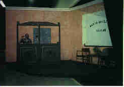 This picture is from our most recent play, "It's a Wonderful Life" which we performed on November 9, and 10, 2001. This is the Bailey Brothers Building and Loan set. That's me as "Aunt Tilly Bailey" on the phone at the window there. I'm quite proud of this set because Jee-Youn, Jennifer, and I did most of the painting. Jee-Youn and I did that fabulous window and that beautiful teller desk and Jennifer did the texturizing on the wall. |