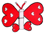 For this craft you will need wooden clothes pins (one for each child), pipe cleaners, glue, acrylic paint, and an assortment of different color craft foam or construction or tissue paper and magnets (optional).Ahead of time, paint the clothes pins either red, white or pink to match the rest of your decorations. You can cut three 4" antennae out of one 12" pipe cleaner. With either the craft foam or construction paper, cut out 2 sets of hearts, one set larger than the other for the butterfly's wings. These hearts can be decorated with stickers or smaller cut out hearts. Glue the 4 hearts and 4" pipe cleaner bent in half for the anttennae to the underside of the clothes pin leaving the clip open. Alternately, you can fan fold pretty tissue paper and glue underneath. These butterflies can be used to clip the top of treat bags, or you can glue a magnet on the back. | |