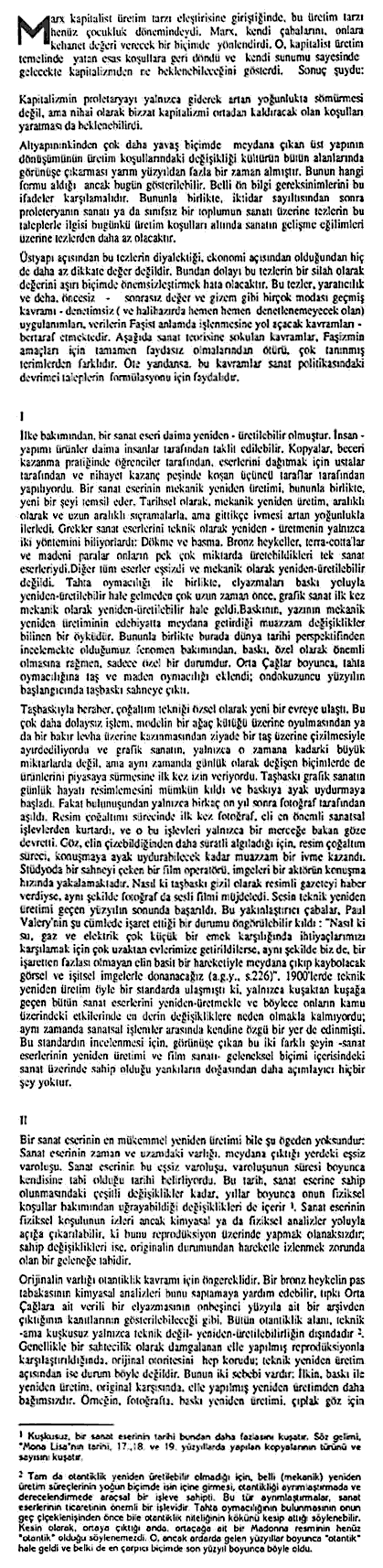 W. Benjamin, fotograf dunyasinda referans isimlerden... Ozellikle yayinladigimiz yazisi, 20. yuzyil dusunurlerinden Benjamin'i, gorsellik evreninin ve bunun toplumsal yansimalarinin cozumlenmesinde one cikariyor. Uzerinde dusunup tartisabilmeyi umarak aktardigimiz asagidaki metin, Edebiyat-Elestiri dergisinin Mart-Haziran'93 sayisinda, Hakki Hunler Cevirisi olarak yayinlanmisti.