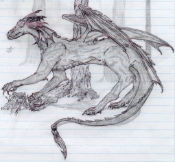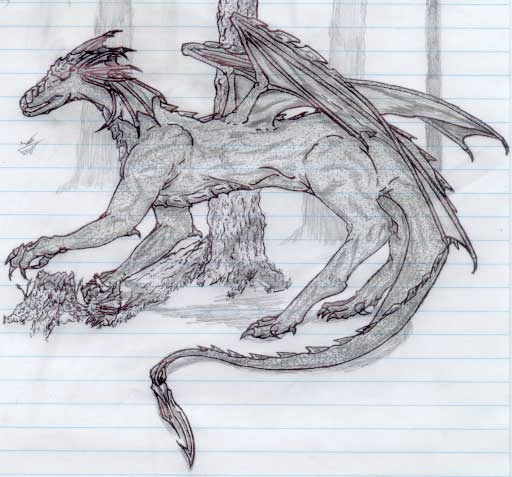 A rustle shifts the branches of a small bush, then another. Then they explode in a flurry of sticks and leaves as a small animal launches itself at an unwary deer. But, the lunge falls short by inches as the timid animal turns and bolts away down a game-trail, disappearing in seconds. As the leaves slowly settle to the forest floor, a shape cuts through one of the many shafts of light that poke their way through the inter-weaved branches overhead. Then an exasperated whoosh of air, followed by a dull snap. A bronze-clawed foot steps into a pool of light between several trees. It is soon followed by a small, violet and blue, serpent-like head. The head turns its shimmering violet eyes to the nearby trees for any hint of its prey. The creature pauses, and stretches to its full height of three feet, straightening its neck, revealing the shimmering, deep violet scales of its underside. Sniffing at the air, it finds a familiar scent, not of prey, but of danger. In the time it takes to blink, the creature disappears. A few minutes later, a soft voice murmurs through the trees.
